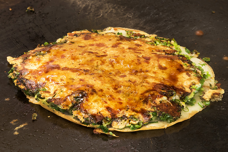 まず生地を鉄板に広げ、そこに具材をのせていきます。